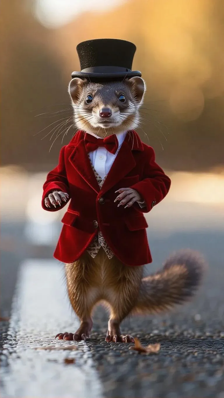 A cunning weasel slyly makes its way down the runway with a mischievous grin. It wears a sleek, red velvet jacket and a tiny top hat, giving it a dapper look. The weasel's bushy tail sways as it walks, adding to its charm.