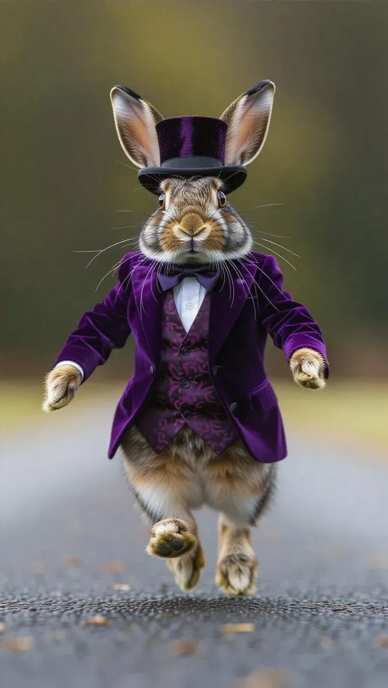 A crafty hare lightly hops down the runway with a mischievous smile. It wears a classy, purple velvet jacket and a tiny top hat, giving it a formal appearance. The hare's long ears perk up as it moves, adding to its charm.