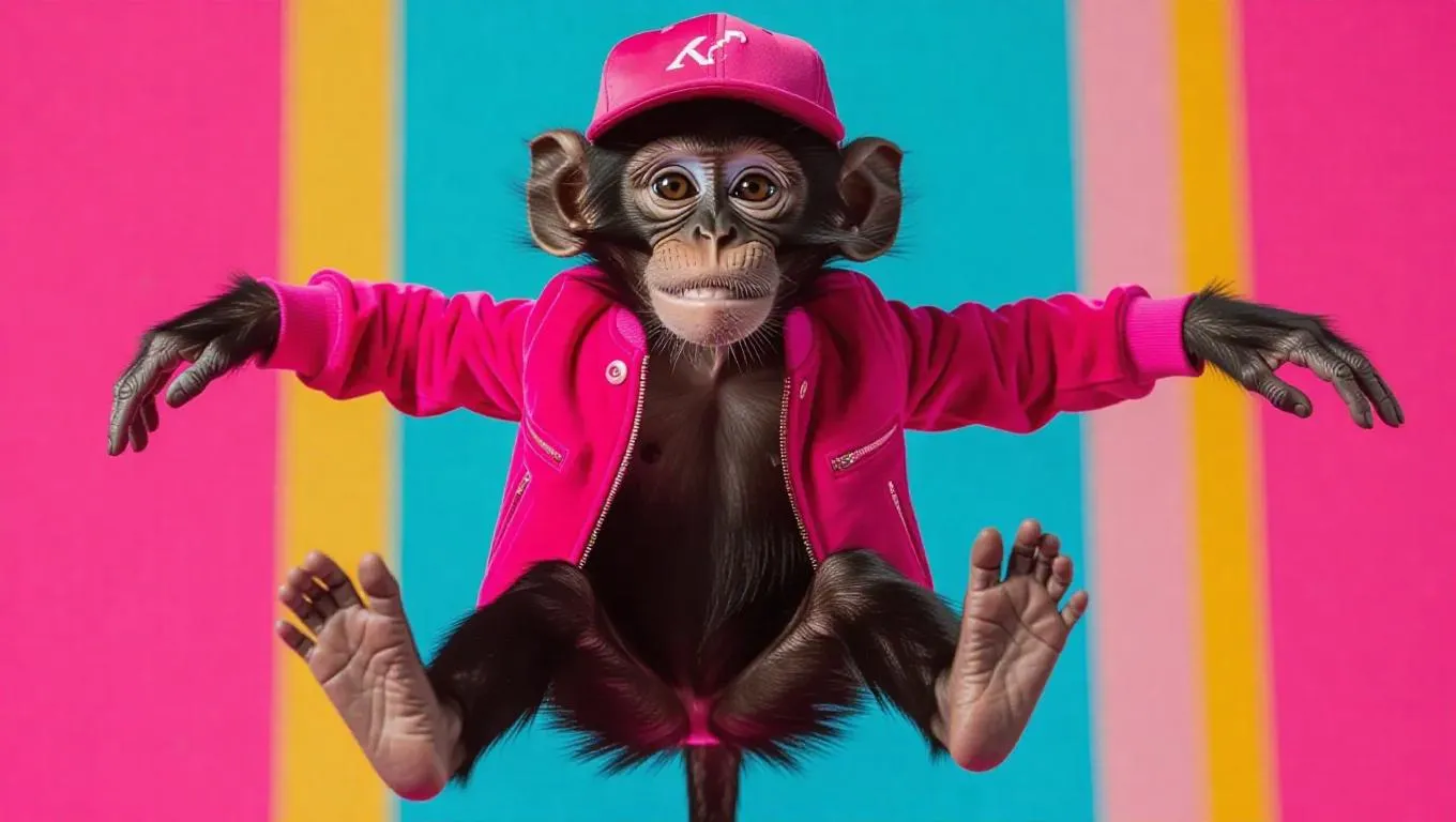 A playful monkey swings down the runway with a cheeky grin. It wears a funky, pink velvet jacket and a tiny baseball cap, giving it a sporty vibe. The monkey's long limbs are animated as it showcases its moves, amplifying its charm.