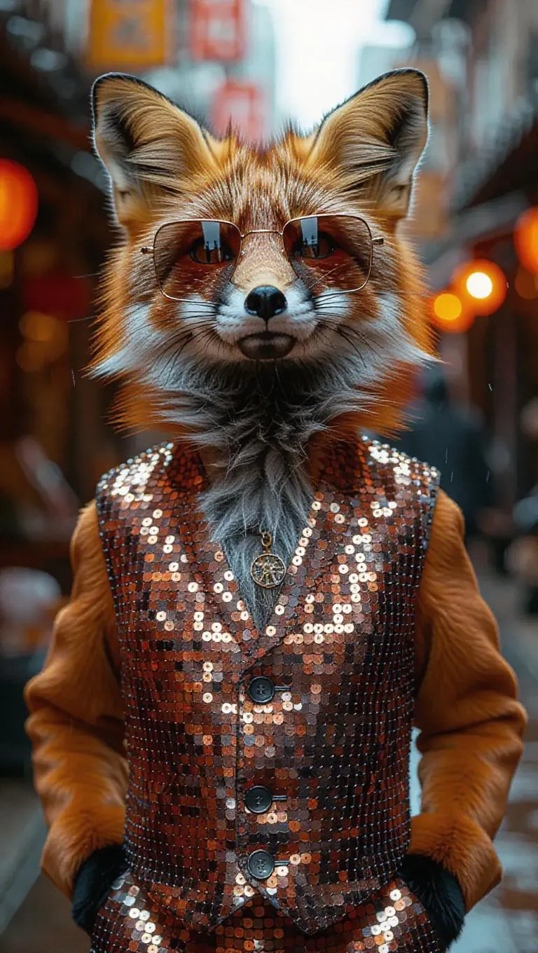 A cheerful T 台 scene featuring a fashionable fox strutting confidently in a sequined vest, wearing oversized square sunglasses, creating a glamorous and vibrant atmosphere.