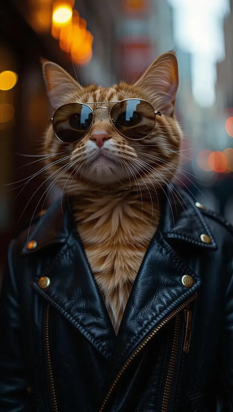 A cheerful T 台 scene featuring a hip cat strutting confidently in a leather bomber jacket, wearing sleek aviator sunglasses, creating a bold and spirited atmosphere.