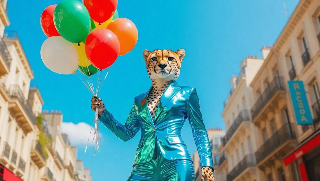 A cheerful T 台 scene featuring a sleek cheetah strutting confidently in a sparkling blue jumpsuit, holding a bouquet of colorful balloons in green, red, and white, floating playfully above him, creating a whimsical and vibrant atmosphere.