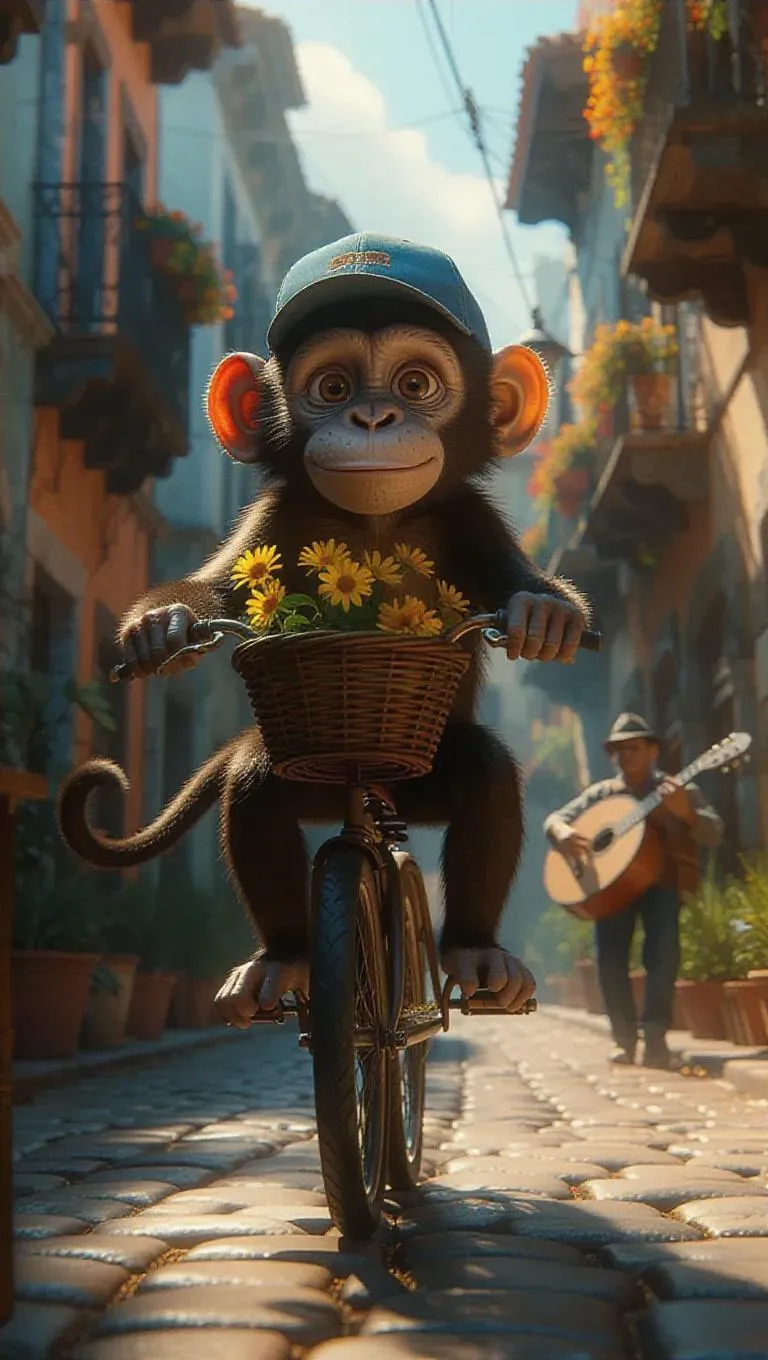 A whimsical monkey swings atop a bicycle, pedaling down a cobblestone street. The monkey, with its playful brown fur and a blue baseball cap, holds a basket of yellow flowers in its front paws. The street is lined with colorful murals that cast a vibrant glow on the scene. In the distance, a street musician playing a zither nearby.