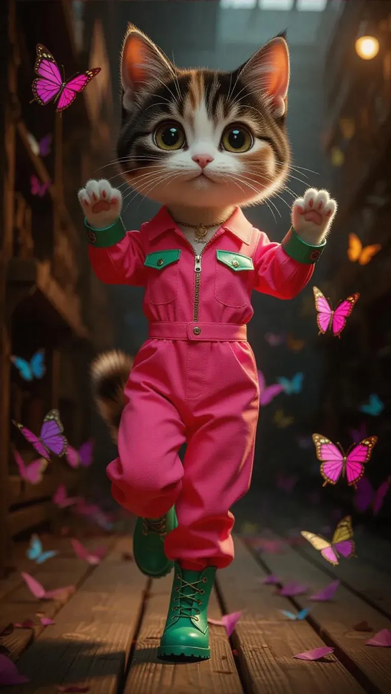 Full body, tiny cute little calico cat with hazel eyes, delicate eyelashes, blush on the cheeks, cute, cartoon, photorealism, walking proudly on a rustic runway, dressed in a bright pink jumpsuit with glowing teal accents, wearing vibrant green boots, striking a pose with its tail raised high, surrounded by animated butterflies.