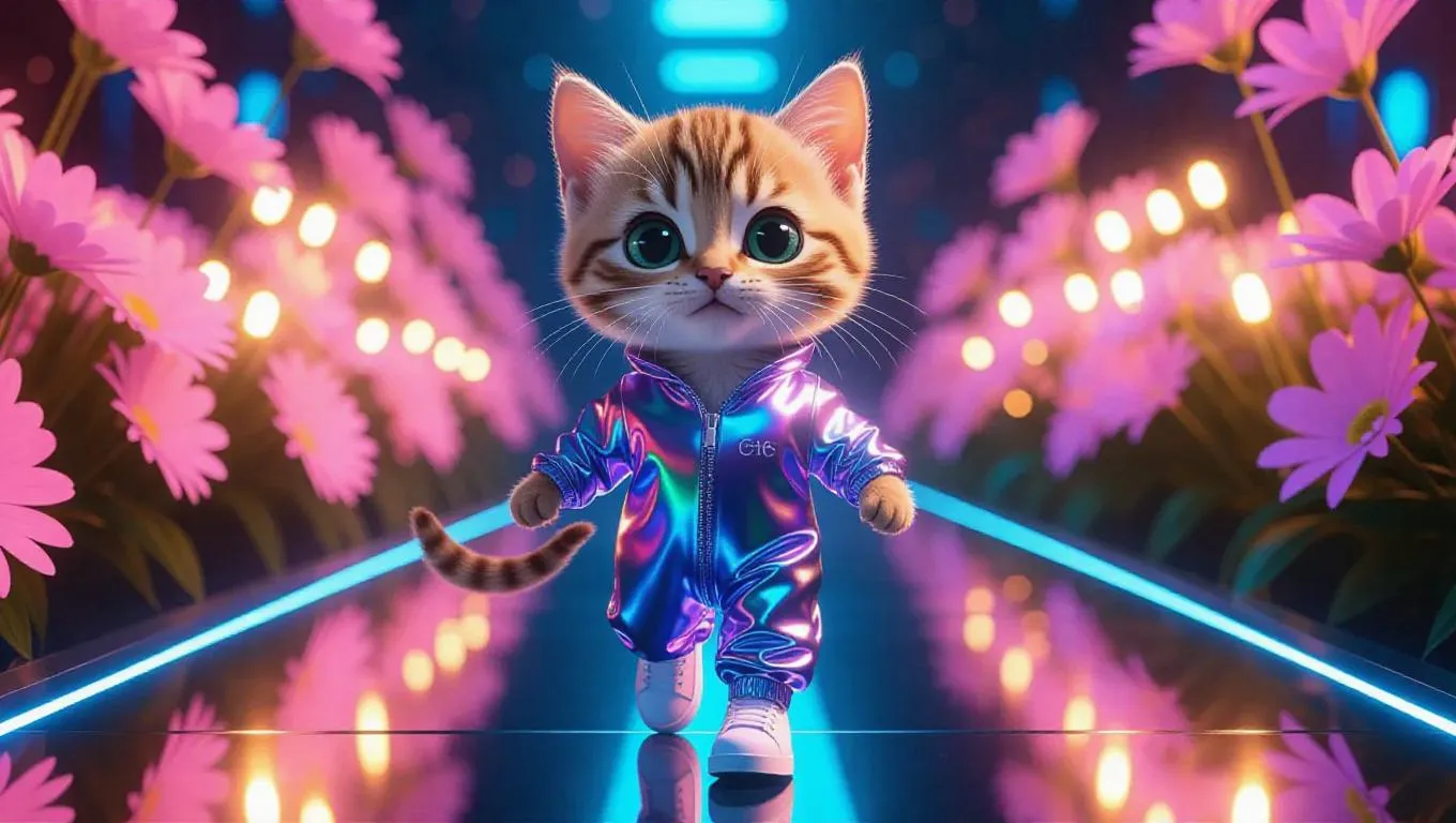 Full body, tiny cute little fawn cat with emerald eyes, delicate eyelashes, blush on the cheeks, cute, cartoon, photorealism, strutting confidently on a metallic runway, dressed in a holographic jumpsuit with glowing blue accents, wearing chic white sneakers, striking a pose with a confident smile, surrounded by holographic flowers.
