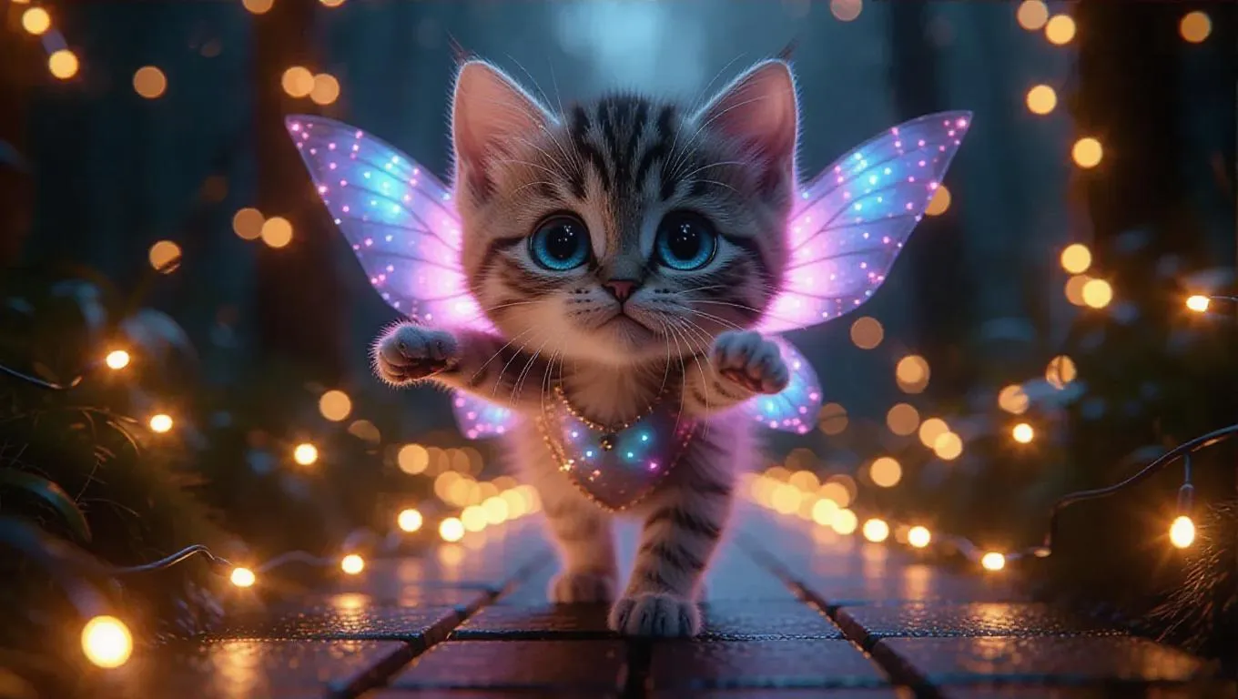 Full body, tiny cute little rascal cat with ice-blue eyes, delicate eyelashes, blush on the cheeks, cute, cartoon, photorealism, waddling whimsically on an enchanted runway, dressed in a whimsical fairy-tale jumpsuit with glowing pastel accents, wearing playful elf shoes, striking a pose with a cheeky expression, surrounded by fairy lights.