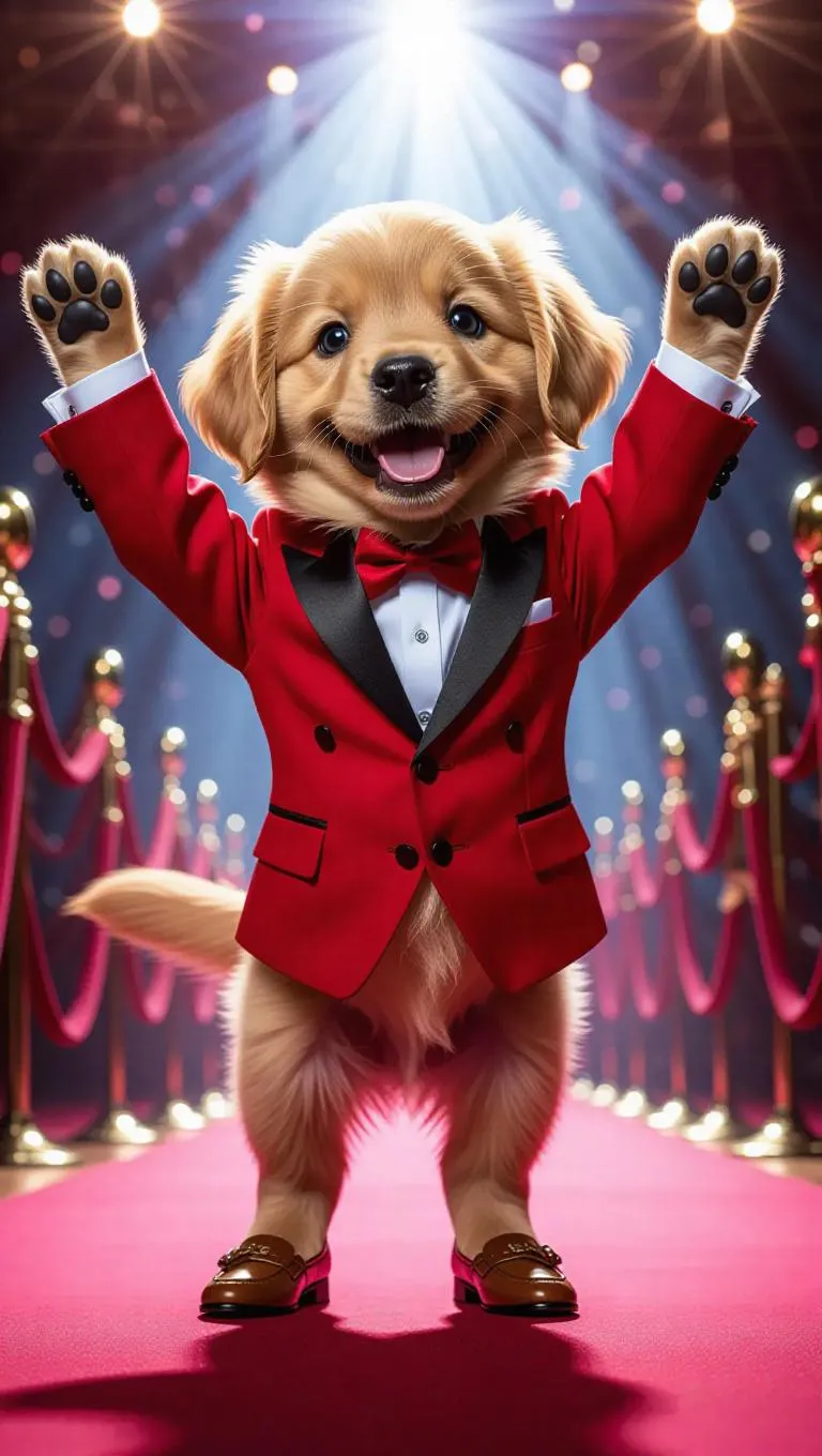 Full body, tiny cute little golden retriever puppy with blue eyes, delicate eyelashes, blush on the ears, cute, cartoon, photorealism, posing playfully on a vibrant runway, dressed in a tailored red tuxedo with a bow tie, wearing shiny brown loafers, arms raised triumphantly, with a joyful grin, surrounded by dramatic stage lighting.