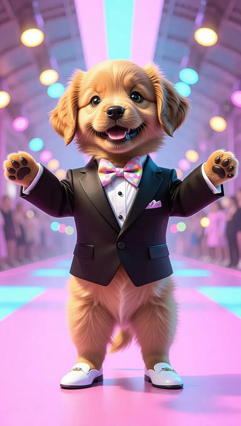 Full body, tiny cute little golden retriever puppy with green eyes, delicate eyelashes, blush on the paws, cute, cartoon, photorealism, posing elegantly on a colorful runway, dressed in a tailored black tuxedo with a colorful bow tie, wearing polished white loafers, arms wide open, with an excited expression, surrounded by soft pastel lighting.