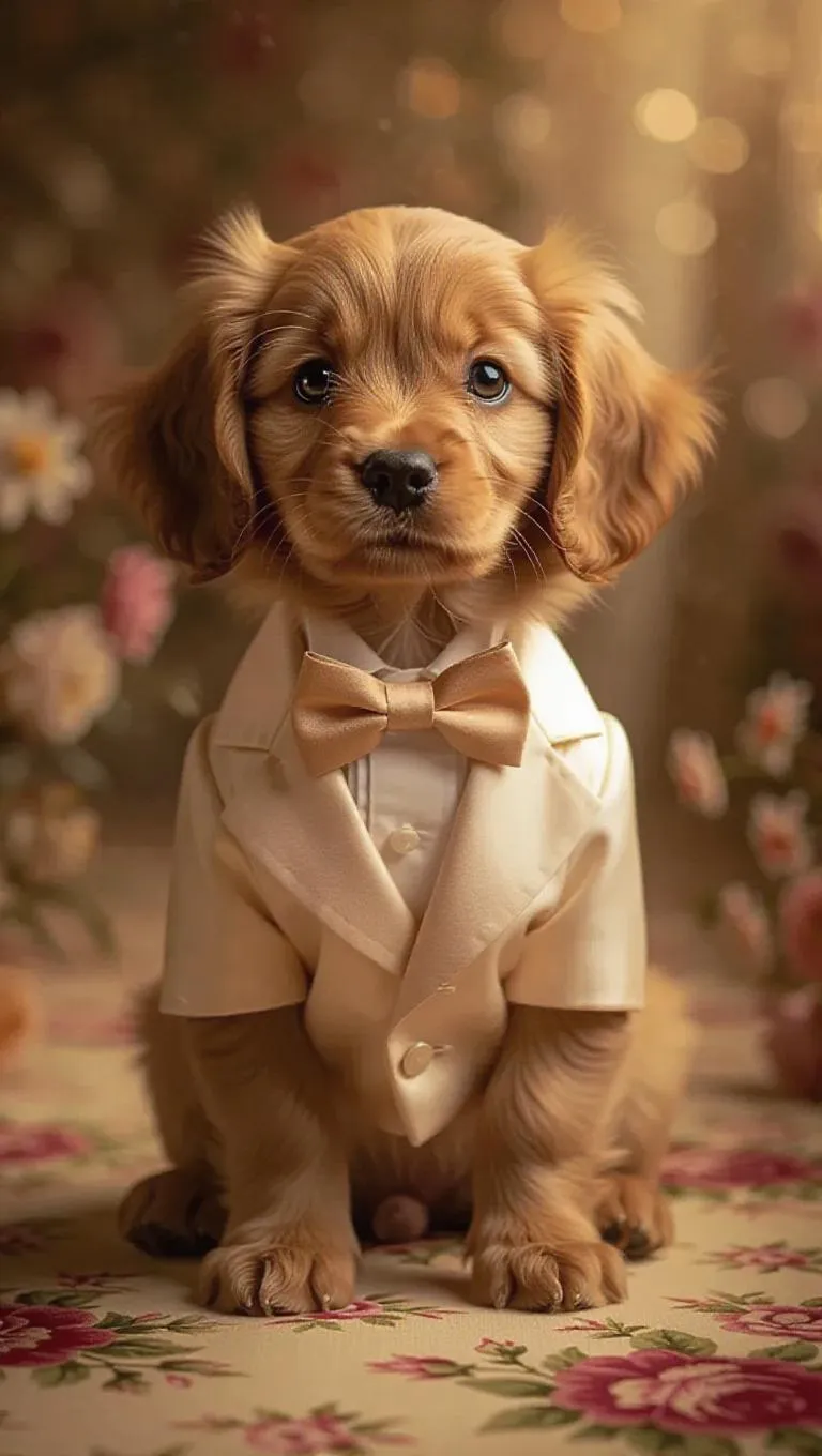Full body, tiny cute little golden retriever puppy with amber eyes, long eyelashes, blush on the chin, cute, cartoon, photorealism, posing cutely on a floral runway, dressed in a classic ivory tuxedo with an elegant bow tie, wearing polished tan loafers, tilting head innocently, with a playful smirk, surrounded by warm golden lighting.