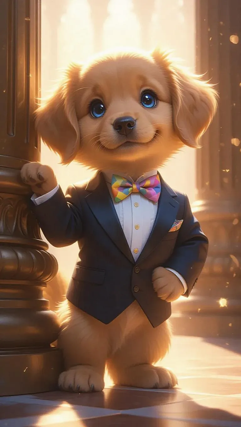 Full body, tiny cute little golden retriever puppy with bright blue eyes, lengthy eyelashes, blush on the ears, cute, cartoon, photorealism, posing confidently on a sophisticated runway, dressed in a sharp charcoal tuxedo with a colorful bow tie, wearing dapper black loafers, leaning against a stylized column, with a cool demeanor, surrounded by soft spotlighting.