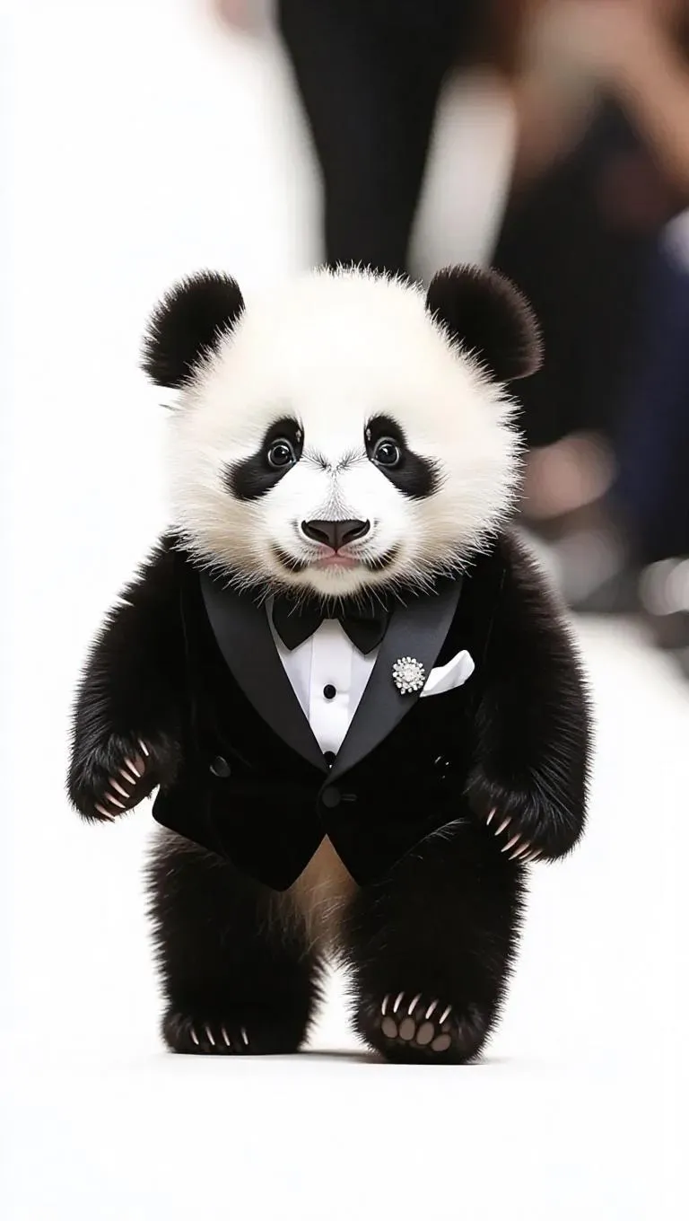 The fluffy panda cub, dressed in a striking tuxedo, ambles down the runway with a curious look. The camera follows its relaxed steps, capturing the movement of the tuxedo and the panda cub's round ears. The background remains an elegant runway, highlighting the panda cub's adorable and whimsical charm.