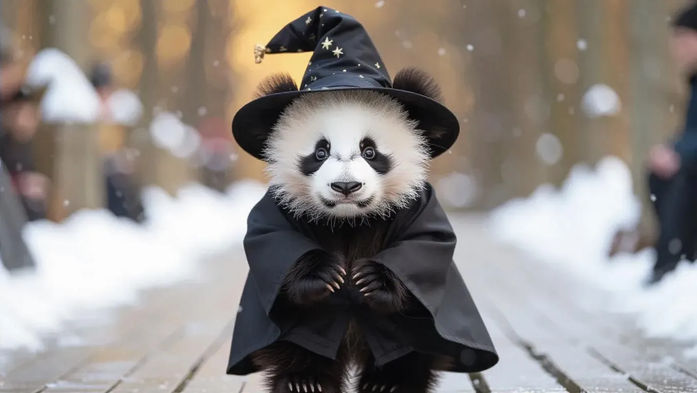 The fluffy panda cub, dressed in a wizard hat and robe, ambles down the runway with a curious look. The camera follows its relaxed steps, capturing the movement of the robe and the panda cub's round ears. The background remains a magical runway, highlighting the panda cub's adorable and whimsical charm.