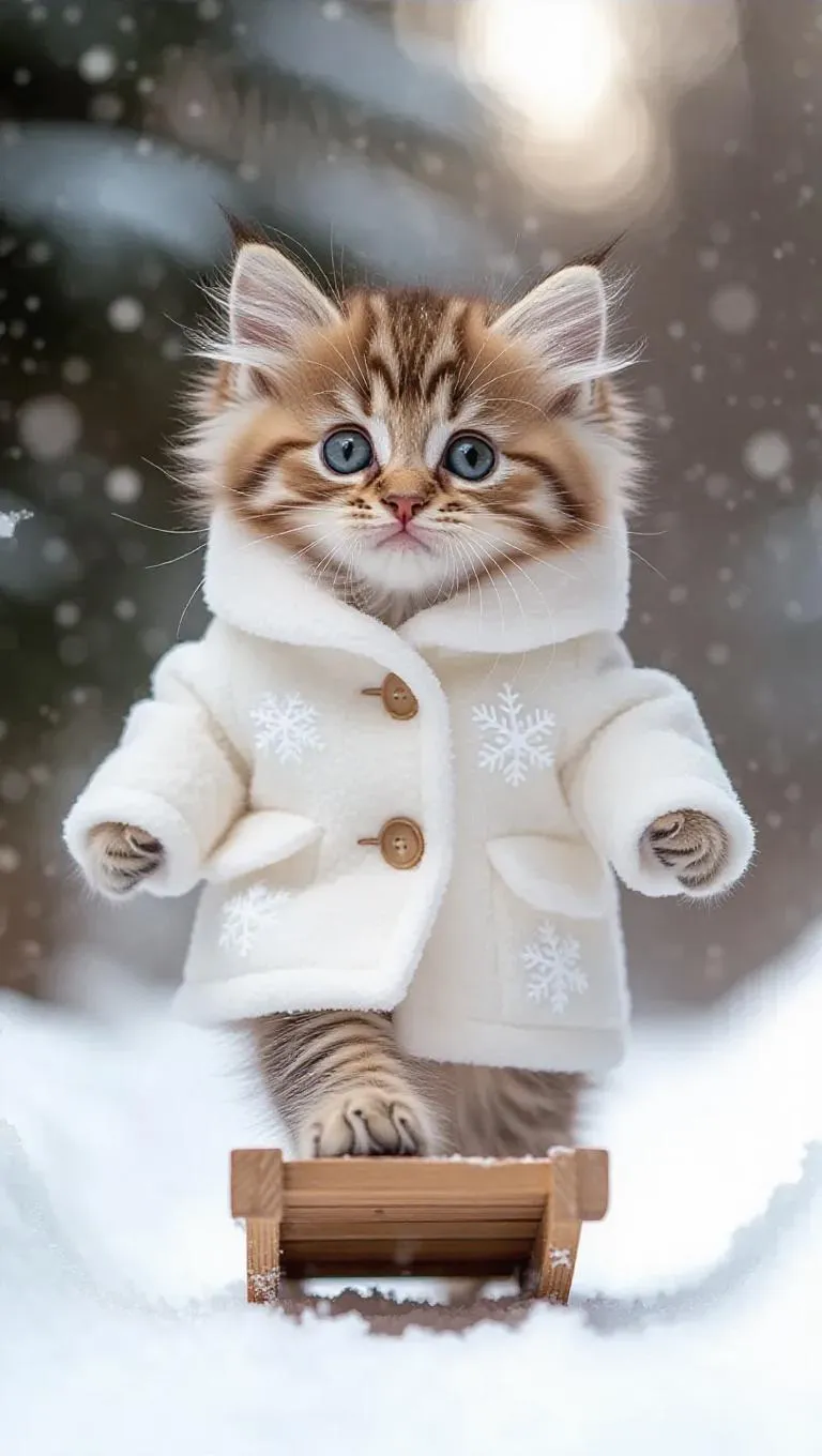 The fluffy kitten, wearing a cute white coat with snowflake designs and carrying a tiny sled, tiptoes down the runway with a whimsical look. The camera follows its delicate steps, capturing the movement of the coat and the kitten’s ears. The background remains a winter wonderland runway, highlighting the kitten’s enchanting and festive charm.