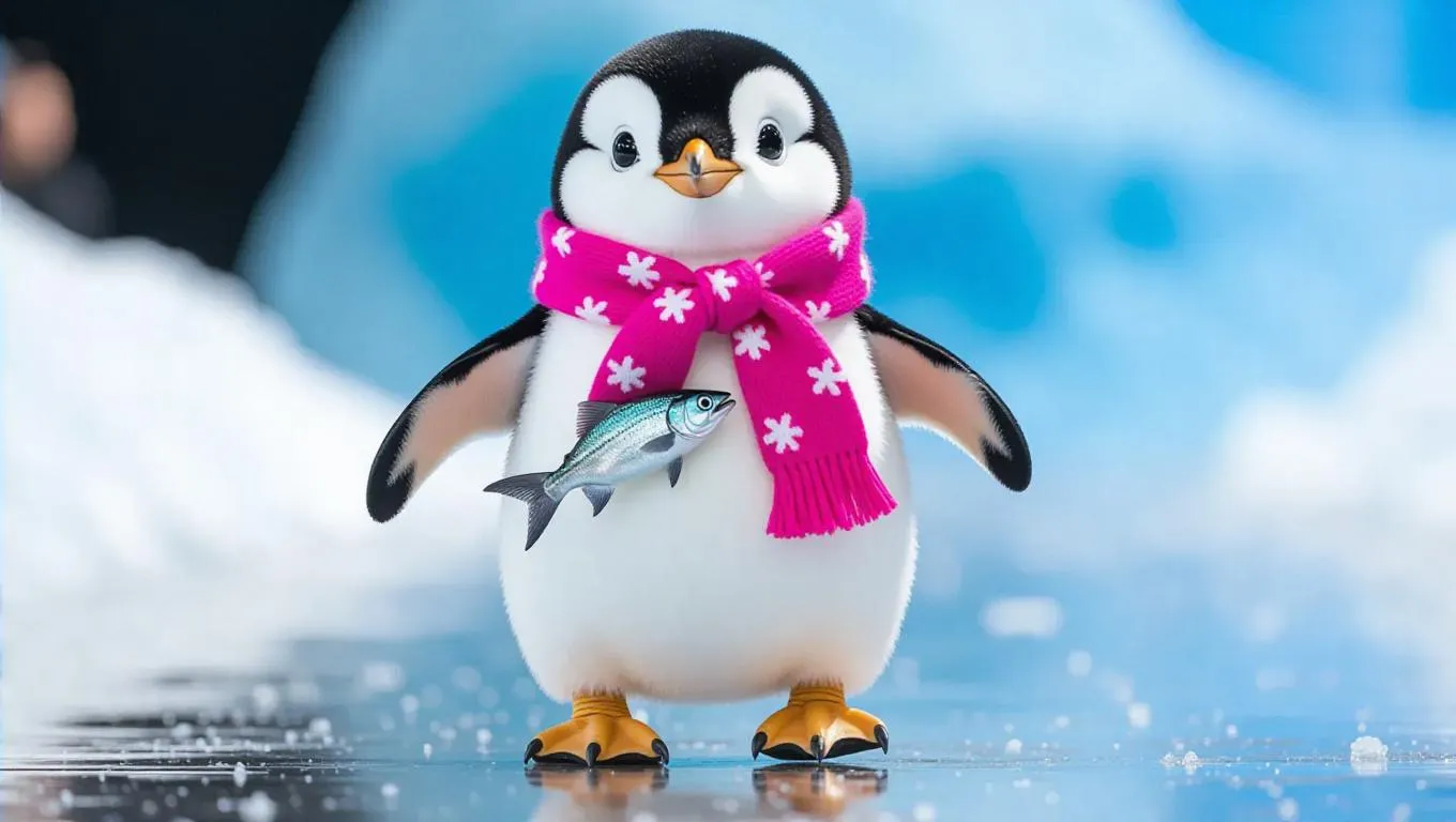 The fluffy penguin, wearing a bright pink scarf with bow patterns and carrying a small fish, waddles down the runway with a curious look. The camera follows its gentle steps, capturing the movement of the scarf and the penguin's flippers. The background remains an icy, polar-themed runway, highlighting the penguin’s charming and sweet demeanor.