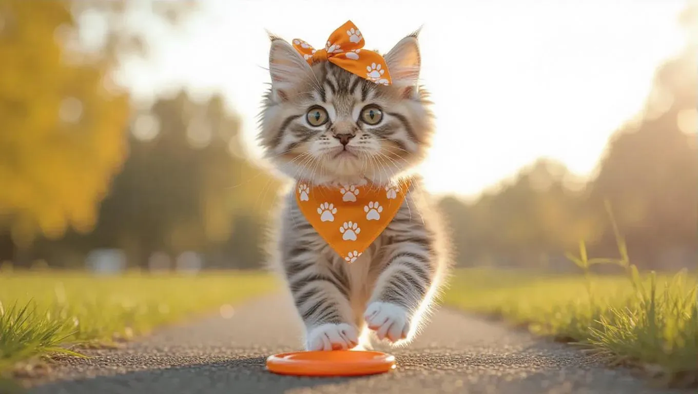 The fluffy kitten, wearing a playful orange bandana with paw prints and carrying a small frisbee, tiptoes down the runway with an excited look. The camera follows its delicate steps, capturing the movement of the bandana and the kitten's ears. The background remains a bright, sunny park-themed runway, highlighting the kitten's joyful and energetic spirit.