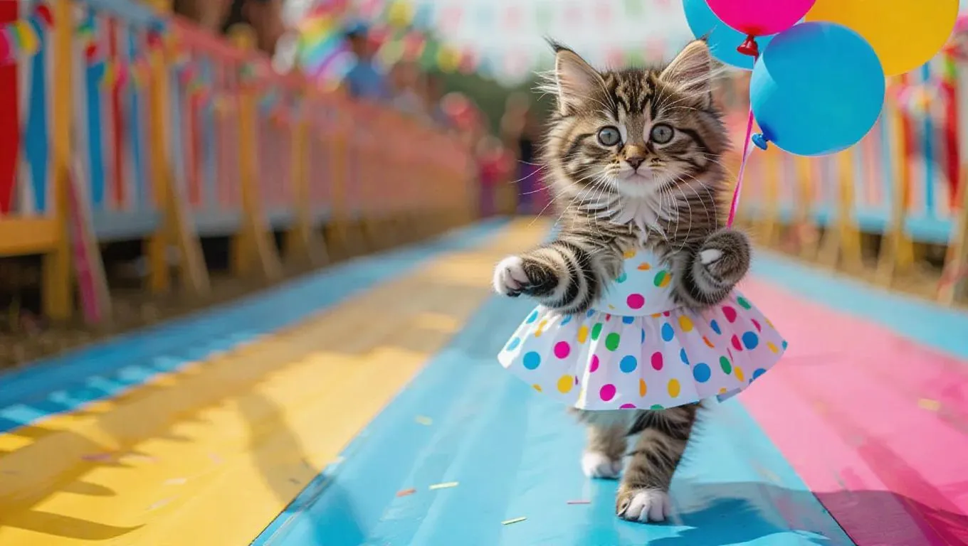 The fluffy kitten, wearing a playful polka-dot skirt and carrying a colorful balloon, prances down the runway with a cheerful look. The camera follows its lively steps, capturing the look of joy on the kitten’s face. The background remains a carnival-themed runway, highlighting the kitten’s fun-loving and vibrant personality.