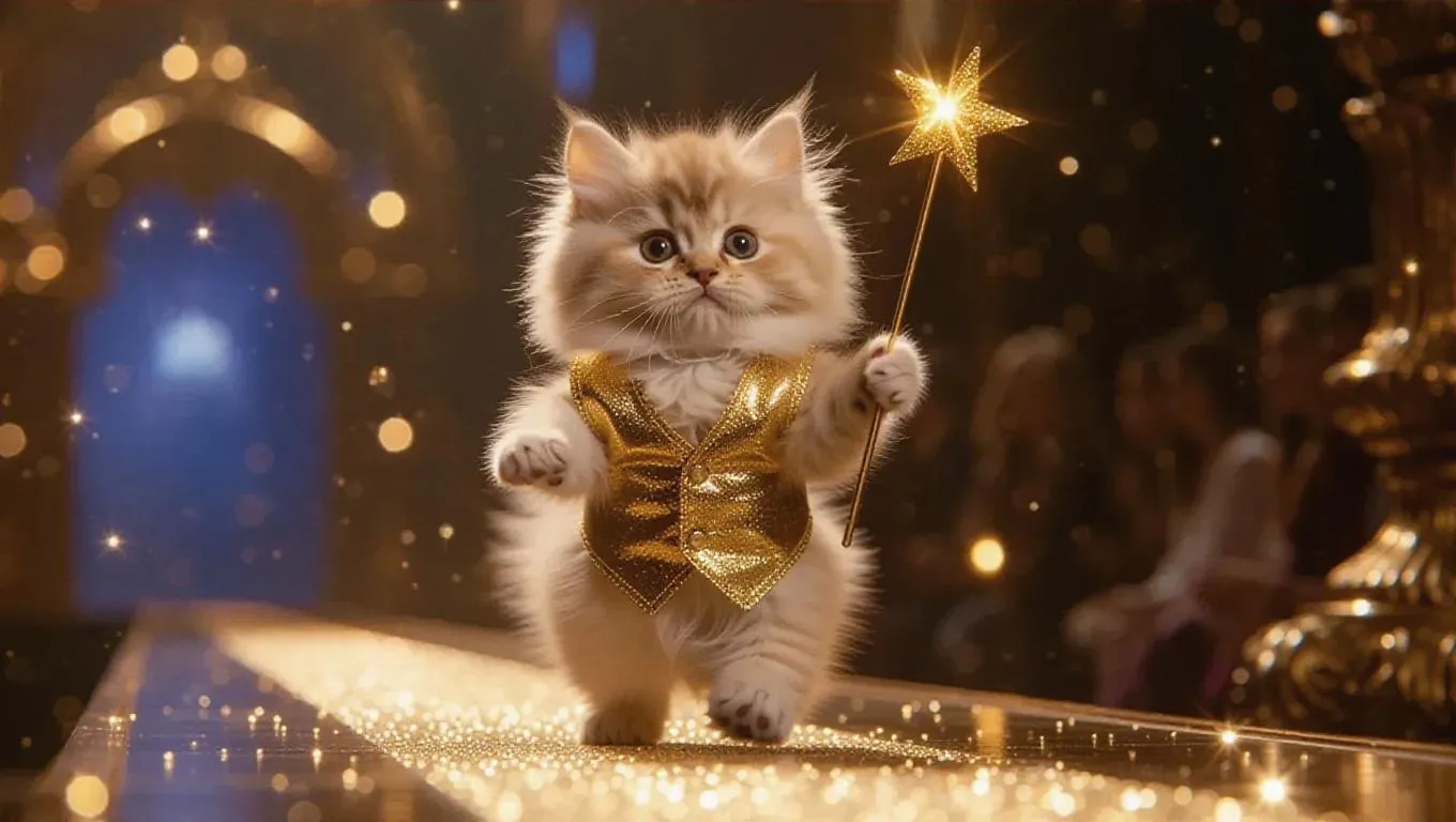 The fluffy kitten, wearing a shimmering gold vest and carrying a small star wand, glides down the runway with a magical look. The camera captures its enchanting steps, highlighting the sparkle in the scene. The background remains a fantasy-themed runway, emphasizing the kitten's whimsical and dreamy nature.