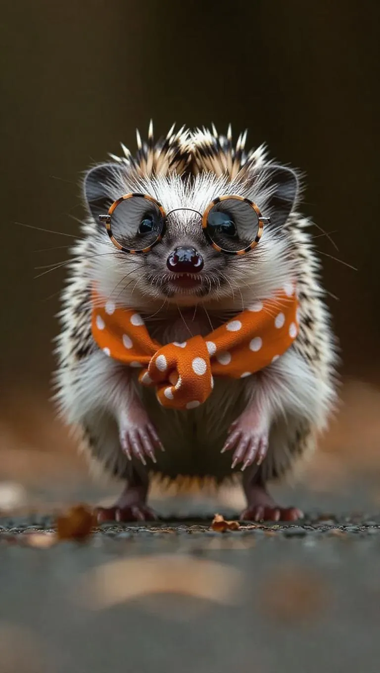 A small hedgehog waddles down the runway with a shy smile, its spiky back making it instantly recognizable. It wears a polka-dot patterned scarf and a pair of round sunglasses, adding a quirky and fun vibe. The hedgehog's clumsy yet endearing movements bring joy to everyone.