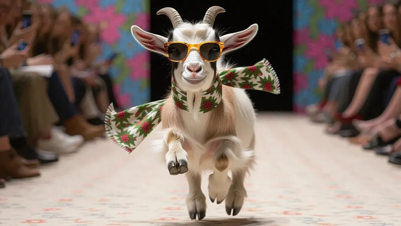 A silly goat bounds down the runway with an exuberant grin, its white and brown coat making it instantly recognizable. It sports a grass-patterned scarf and a pair of playful sunglasses, adding a vibrant and carefree vibe. The goat's bouncy yet amusing movements bring delight to everyone.