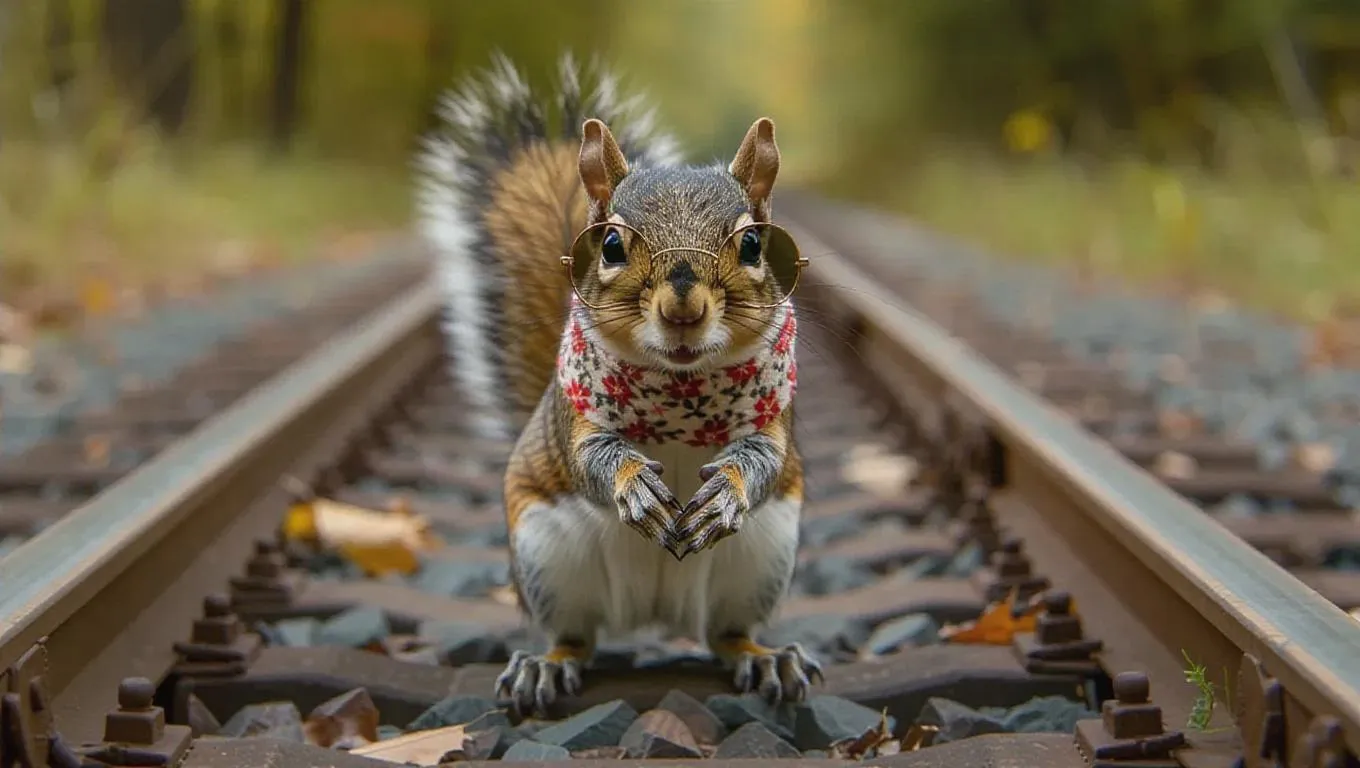 A curious squirrel scampers down the runway with an excited expression, its bushy tail making it instantly recognizable. It sports a nut-patterned scarf and a pair of small round sunglasses, adding a whimsical and adorable vibe. The squirrel's energetic yet playful movements bring smiles to everyone.