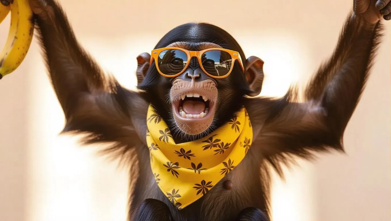 A cheeky monkey swings down the runway with a cheeky expression, its brown fur making it instantly recognizable. It dons a banana-patterned scarf and a pair of bright sunglasses, adding a fun and lively atmosphere. The monkey's playful yet humorous movements bring laughter to everyone.