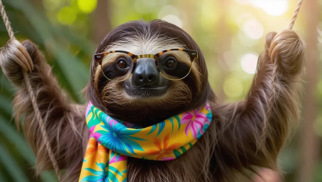 A cuddly sloth hangs down the runway with a mellow grin, its brown fur making it instantly recognizable. It wears a tropical-patterned scarf and a pair of funky sunglasses, adding a relaxed and funky vibe. The sloth's slow yet entertaining movements bring chuckles to everyone.