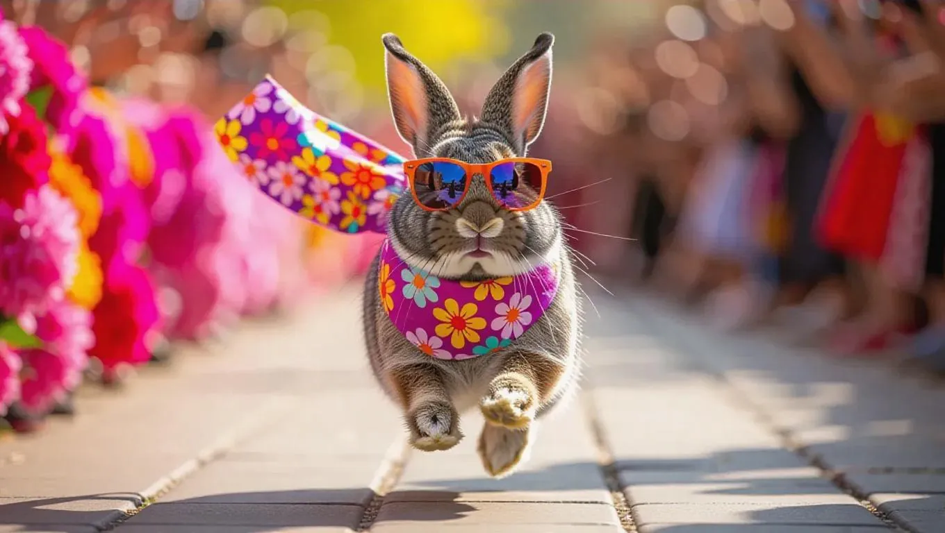 A spirited rabbit races down the runway with an energetic grin, its grey fur making it instantly recognizable. It sports a spring-flower patterned scarf and a pair of colorful sunglasses, adding a cheerful and fresh vibe. The rabbit's quick yet adorable movements bring joy to everyone.