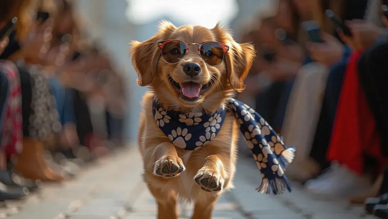 A joyful puppy bounds down the runway with a wagging tail, its golden coat making it instantly recognizable. It sports a paw-print patterned scarf and a pair of playful sunglasses, adding a youthful and fun touch. The puppy's clumsy yet lovable movements bring happiness to everyone.