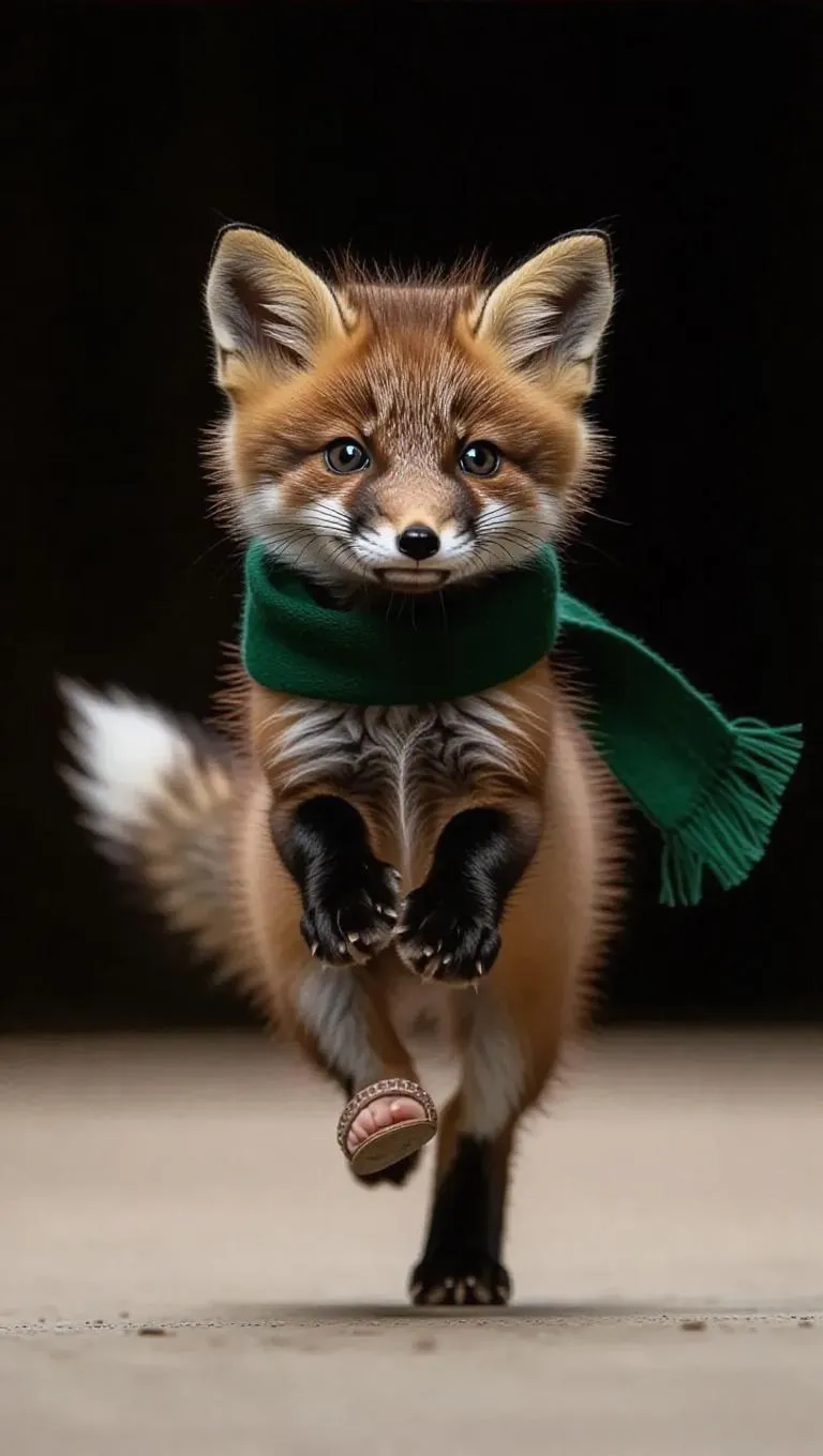 A tiny fox kit struts down the runway with a playful smirk, its feathery tail swishing gracefully. It sports a green scarf and a pair of tiny sandals, creating a whimsical and fashionable appearance. The fox kit's energetic bounce and curious demeanor make it a showstopper.