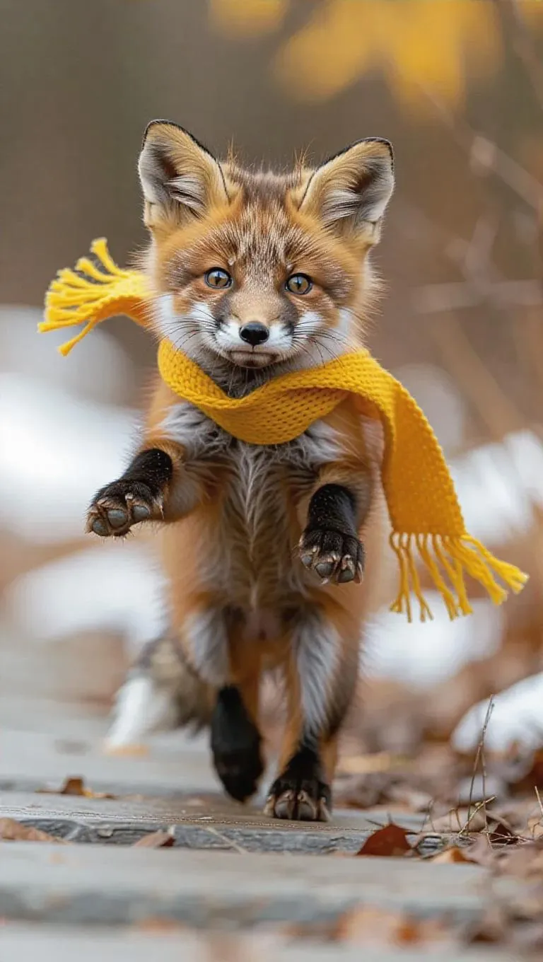 A tiny fox kit dances down the runway with a joyful expression, its bushy tail swirling charmingly. It dons a yellow scarf and a pair of tiny loafers, giving it a vibrant and chic outfit. The fox kit's spirited vibe and adventurous nature draw everyone's attention.