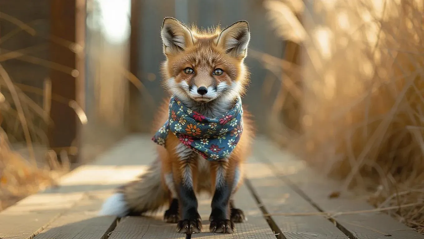 A tiny fox kit bobbles down the runway with a spirited grin, its fluffy tail moving in rhythm. It dons a graphic scarf and tiny sandals, composing a modern and chic outfit. The fox kit's bold energy and curious behavior cast a spell on the audience.