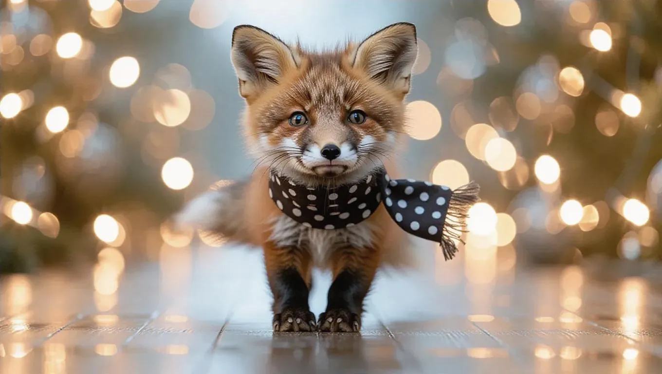 A tiny fox kit weaves down the runway with an adorable smile, its bushy tail shimmering in the lights. It wears a polka-dotted scarf and tiny slip-ons, creating a fun and classic look. The fox kit's charming nature and playful energy make it impossible to overlook.