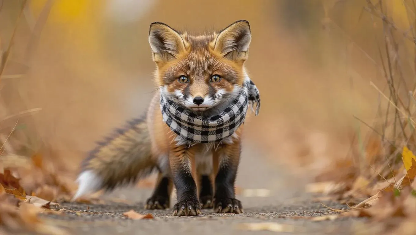 A tiny fox kit tiptoes down the runway with an excited grin, its fluffy tail trailing behind playfully. It wears a checkered scarf and tiny combat boots, creating a trendy and edgy look. The fox kit's spirited essence and playful curiosity shine bright.