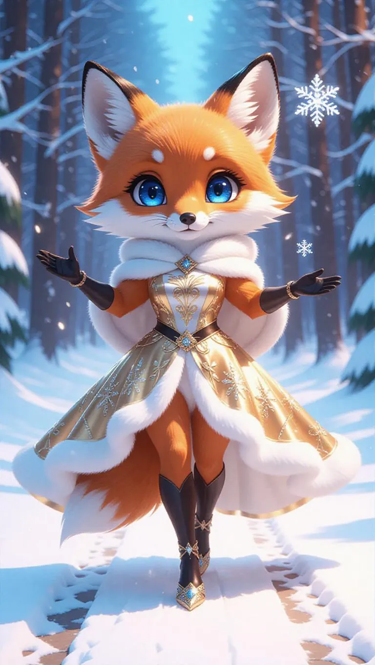 Full body, tiny cute little red fox with blue eyes, delicate eyelashes, blush on the cheeks, cute, cartoon, photorealism, strutting confidently on a winter-themed runway, dressed in a shimmering gold and white gown with a flowing cape, wearing crystal-encrusted heels, arms outstretched, with a magical, glowing snowflakes backdrop.