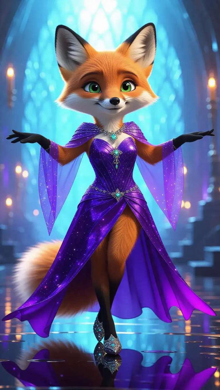 Full body, tiny cute little red fox with green eyes, delicate eyelashes, blush on the cheeks, cute, cartoon, photorealism, strutting confidently on a mystical-themed runway, dressed in a twinkling purple and silver gown with a flowing cape, wearing crystal-encrusted loafers, arms outstretched, with a magical, glowing aurora backdrop.