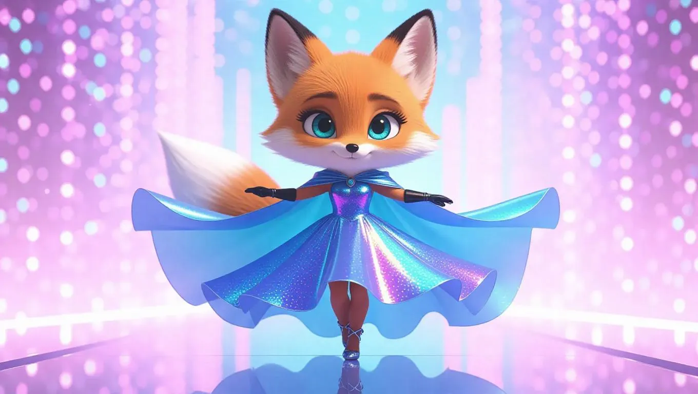 Full body, tiny cute little red fox with teal eyes, delicate eyelashes, blush on the cheeks, cute, cartoon, photorealism, strutting confidently on a space-themed runway, dressed in a holographic gown with a flowing cape, wearing moonstone heels, arms outstretched, with a magical, glowing galaxy backdrop.