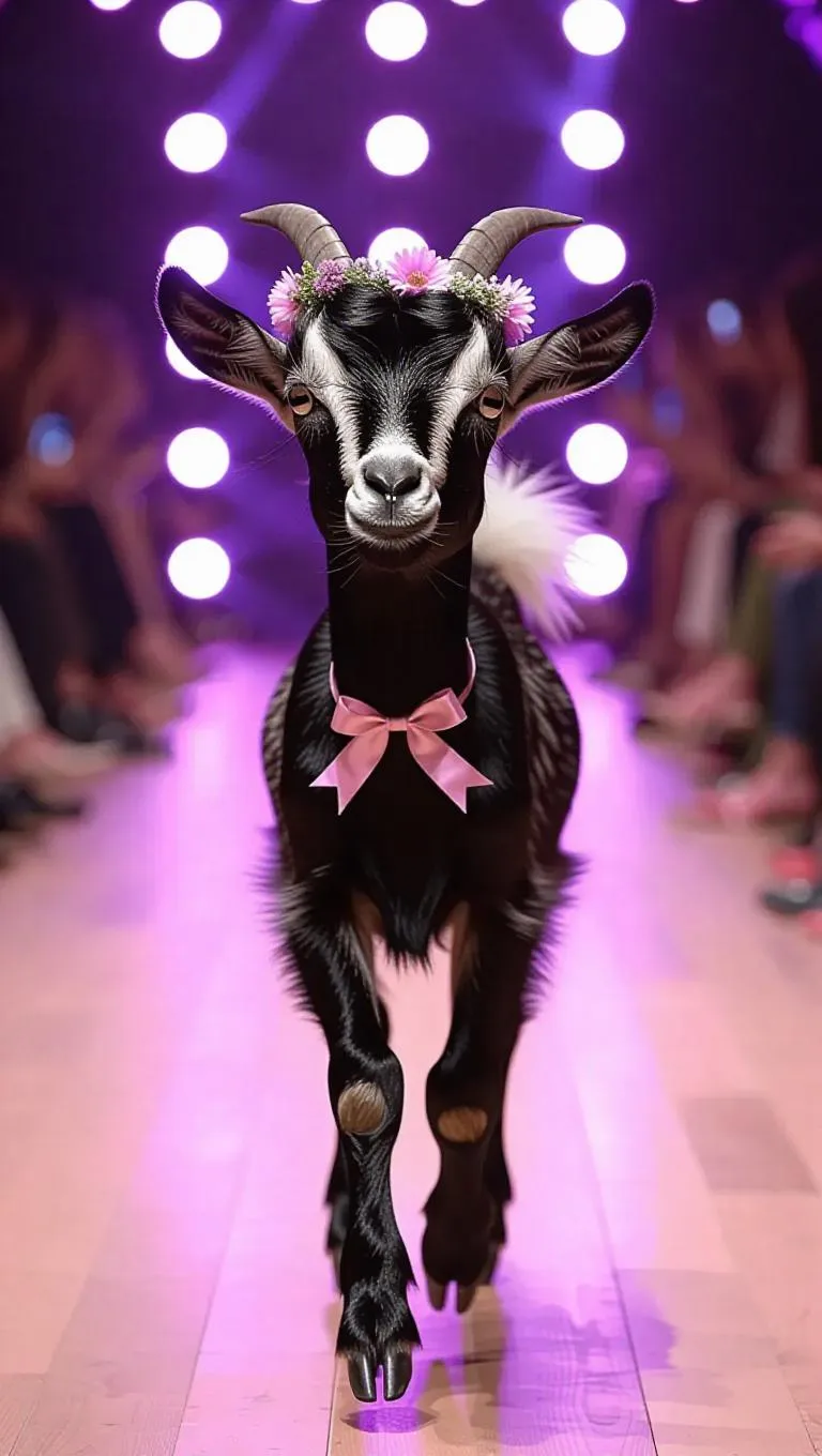 A slender goat prances down the runway, its sleek coat shimmering under the lights. It wears a flower crown atop its head and a tiny bow on its tail, enhancing its playful charm. The goat's cheerful bleats and lively presence create a joyful atmosphere.