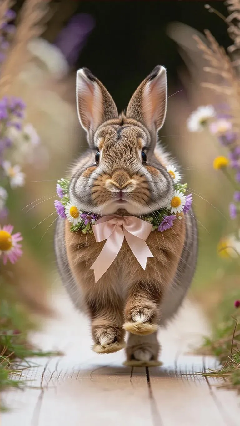 A fluffy rabbit hops down the runway, its soft fur bouncing with each leap. It wears a flower wreath around its neck and a ribbon tied around its ear, injecting a whimsical touch. The rabbit's soft thumps and endearing presence create a cheerful atmosphere.