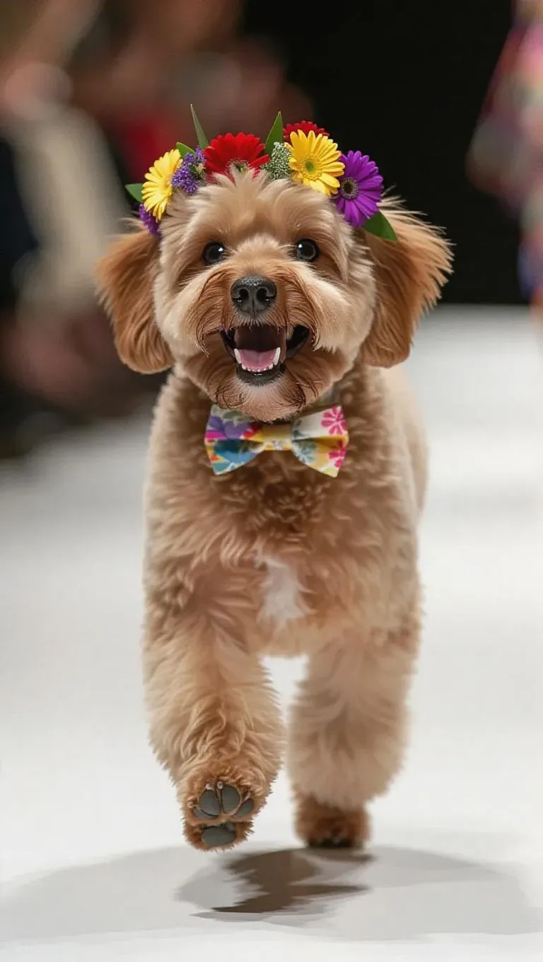 A fluffy dog prances down the runway, its fur bouncing with each step. It wears a floral garland on its head and a stylish bowtie, showcasing its chic personality. The dog's joyful barks and playful presence create a vibrant atmosphere.