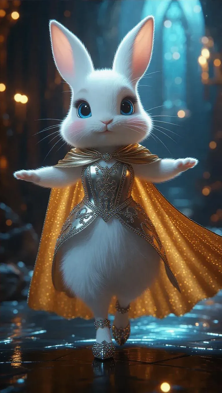 Full body, tiny cute little white bunny with blue eyes, delicate eyelashes, blush on the cheeks, cute, cartoon, photorealism, strutting confidently on a fantasy-themed runway, dressed in a glittering gold and silver gown with a flowing cape, wearing crystal-encrusted heels, arms outstretched, with a magical, glowing backdrop.
