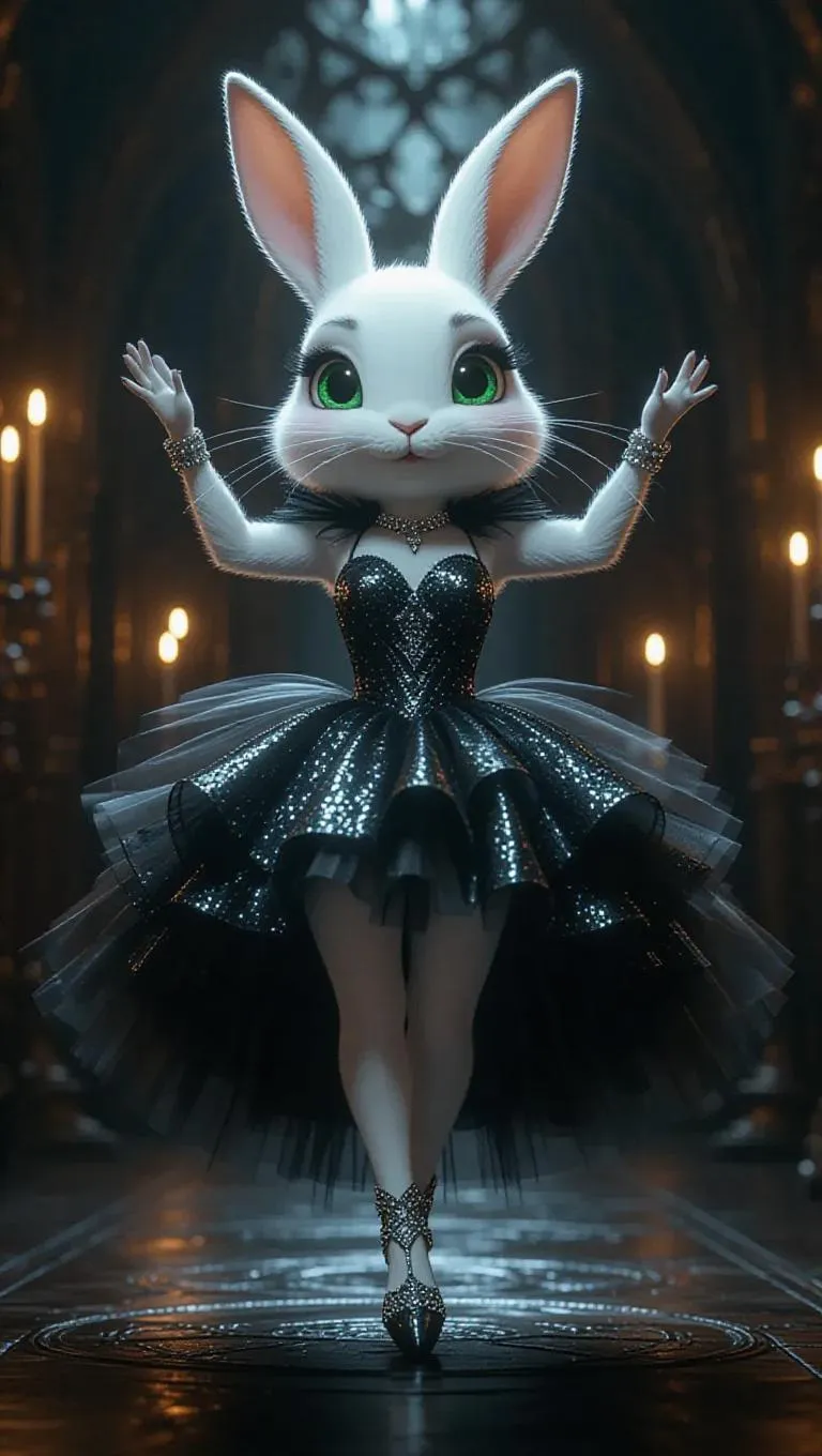 Full body, tiny cute little white bunny with green eyes, delicate eyelashes, blush on the cheeks, cute, cartoon, photorealism, strutting confidently on a gothic-themed runway, dressed in a shimmering silver and black gown with a tulle cape, wearing diamond-encrusted heels, arms held high, with a mystical, swirling backdrop.