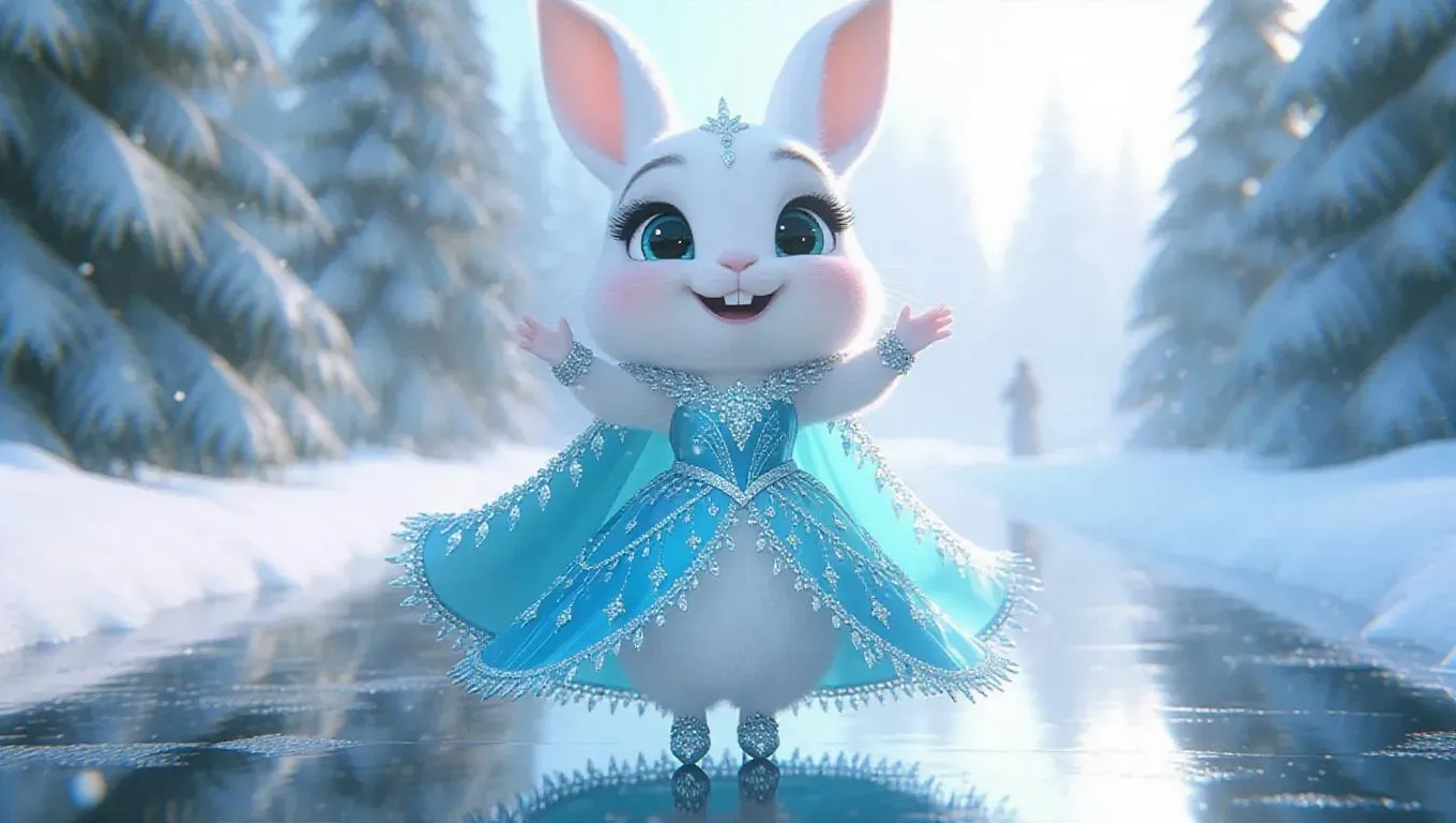Full body, tiny cute little white bunny with striking teal eyes, elegant eyelashes, soft blush on the cheeks, cute, cartoon, photorealism, strutting confidently on a winter-themed runway, dressed in a crystal-blue and silver gown with a frosty cape, wearing ice crystal-embedded heels, arms lifted in excitement, with a snowy, shimmering backdrop.