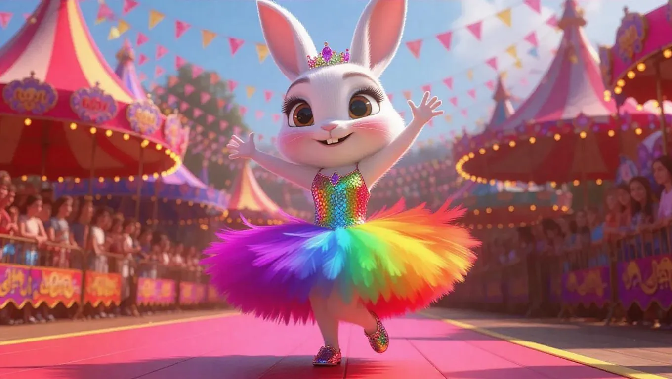 Full body, tiny cute little white bunny with light brown eyes, long eyelashes, rosy blush on the cheeks, cute, cartoon, photorealism, strutting confidently on a carnival parade-themed runway, dressed in a bright rainbow-colored gown with a feathered cape, wearing sparkly dance shoes, arms waving energetically, with a lively, carnival backdrop.