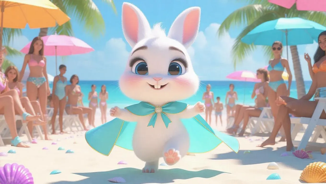 Full body, tiny cute little white bunny with ocean blue eyes, voluminous eyelashes, a soft pink blush on the cheeks, cute, cartoon, photorealism, strutting confidently on a beach party-themed runway, dressed in a breezy light blue and sandy gown with a vibrant cape, wearing shell-encrusted flip-flops, arms relaxed, with a cheerful, beachy backdrop.