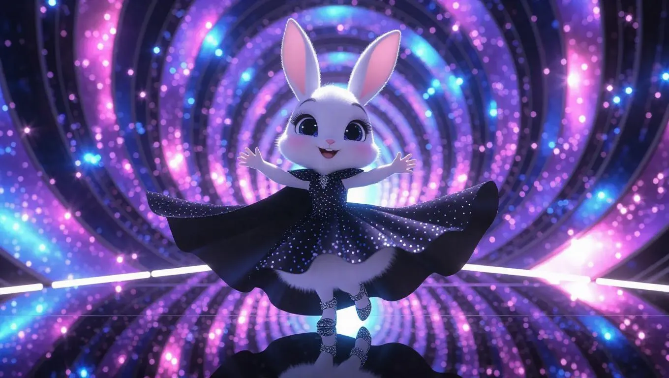 Full body, tiny cute little white bunny with sparkling grey eyes, delicate eyelashes, subtle blush on the cheeks, cute, cartoon, photorealism, strutting confidently on a cosmic-themed runway, dressed in a starry black and silver gown with a glowing cape, wearing cosmic-themed heels, arms open wide, with a galactic, twisting backdrop.