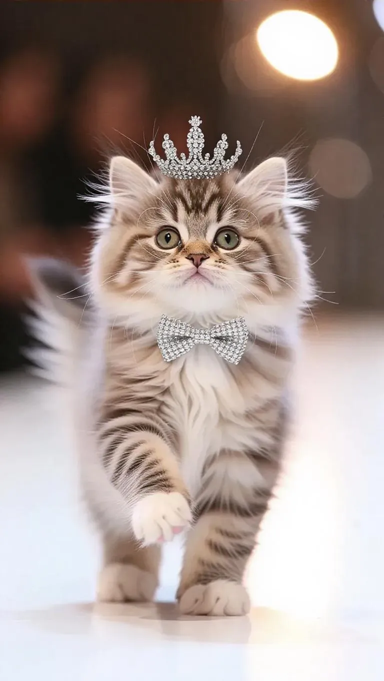 A fluffy kitten prances down the runway with a joyful energy, its tail swaying gently. It wears a sparkling bowtie and a tiny crown, adding a regal flair to its natural adorableness. The kitten's soft meows and curious stares captivate the audience.