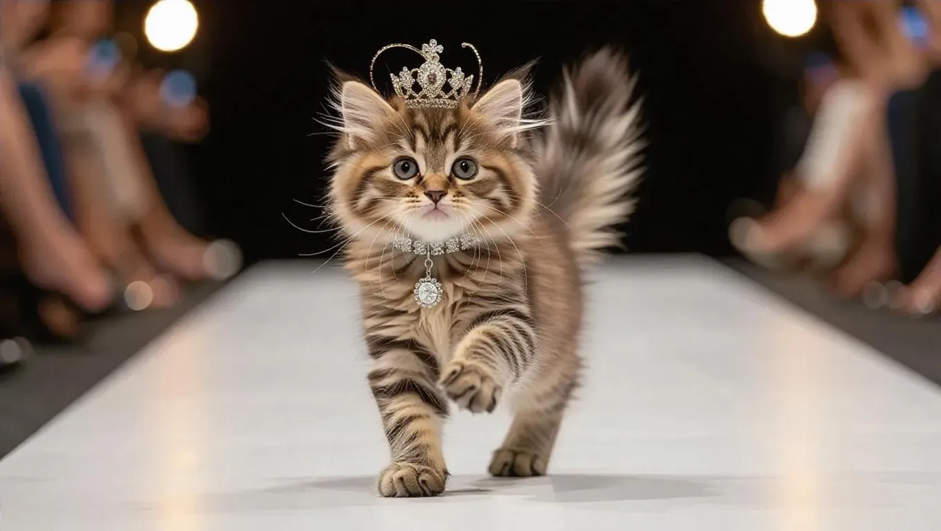 A fluffy kitten prances down the runway with youthful energy, its tail standing tall. It wears a luxury collar and a lively headpiece, adding a touch of sophistication to its natural playfulness. The kitten's excited noises and sparkling gaze captivate the audience.