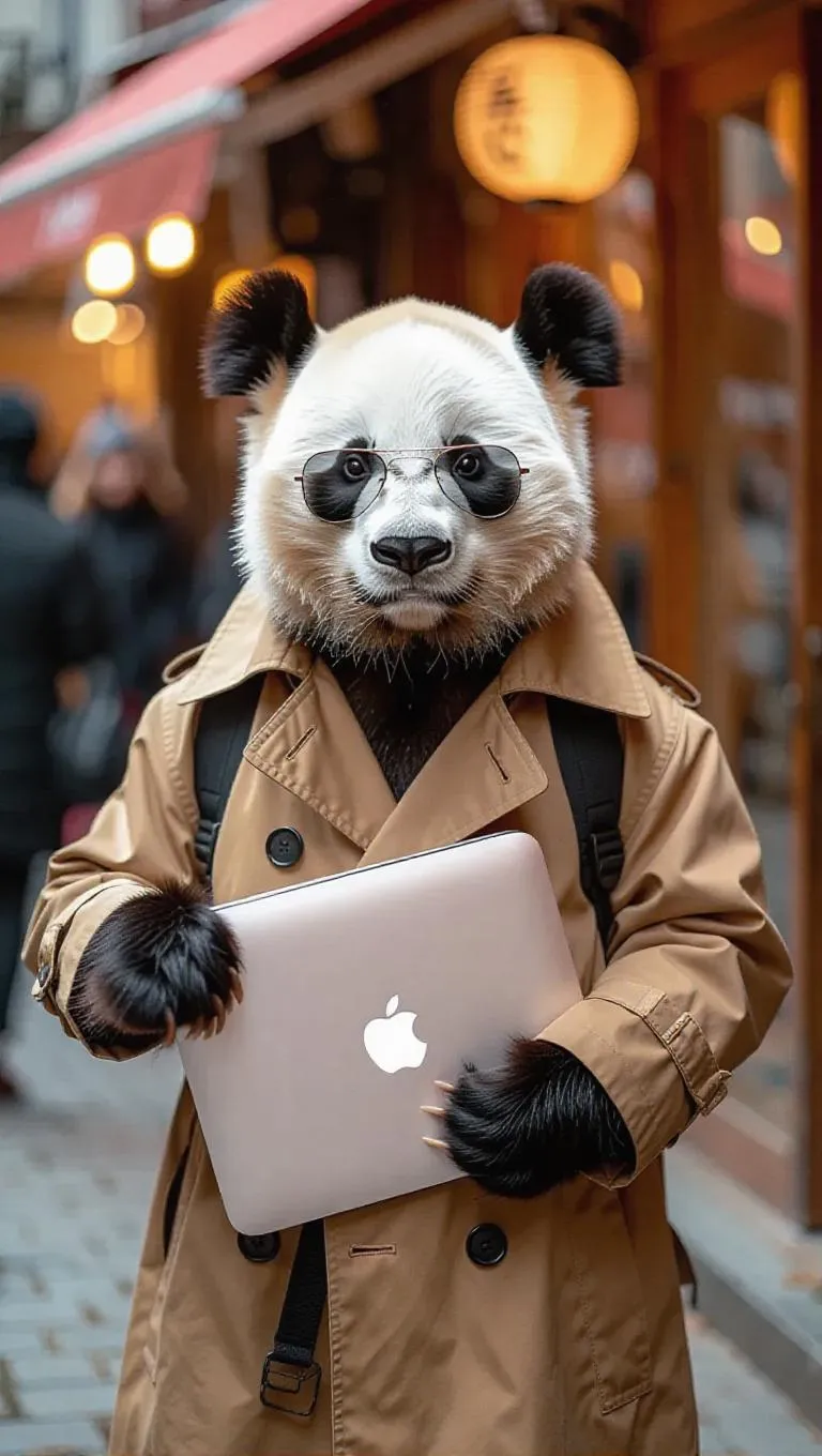 A lively T 台 scene featuring a charming panda strutting stylishly in a retro trench coat with sunglasses, holding a sleek laptop bag, creating a contemporary and cool atmosphere.