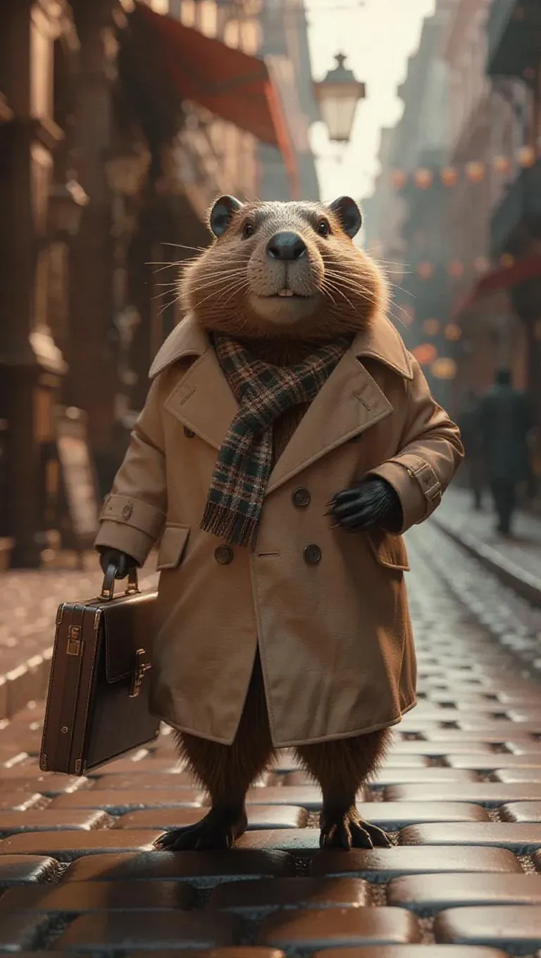 A colorful T 台 scene featuring a cheerful beaver strolling proudly in a bespoke trench coat with a scarf, carrying an elegant briefcase, creating a refined and warm atmosphere.