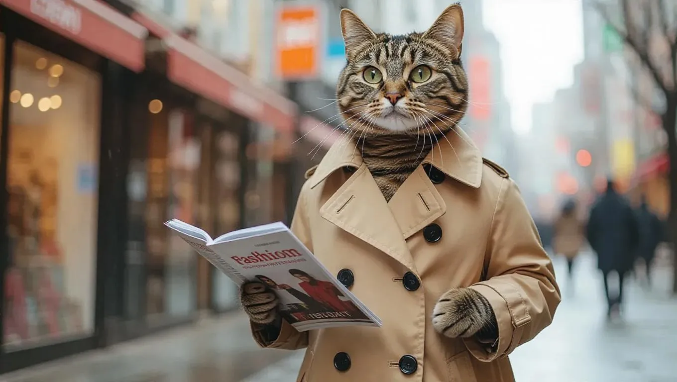 A fashionable T 台 scene featuring a stylish cat walking with poise in an oversized trench coat with a collar, carrying a fashion magazine, creating a high-class and trendy atmosphere.